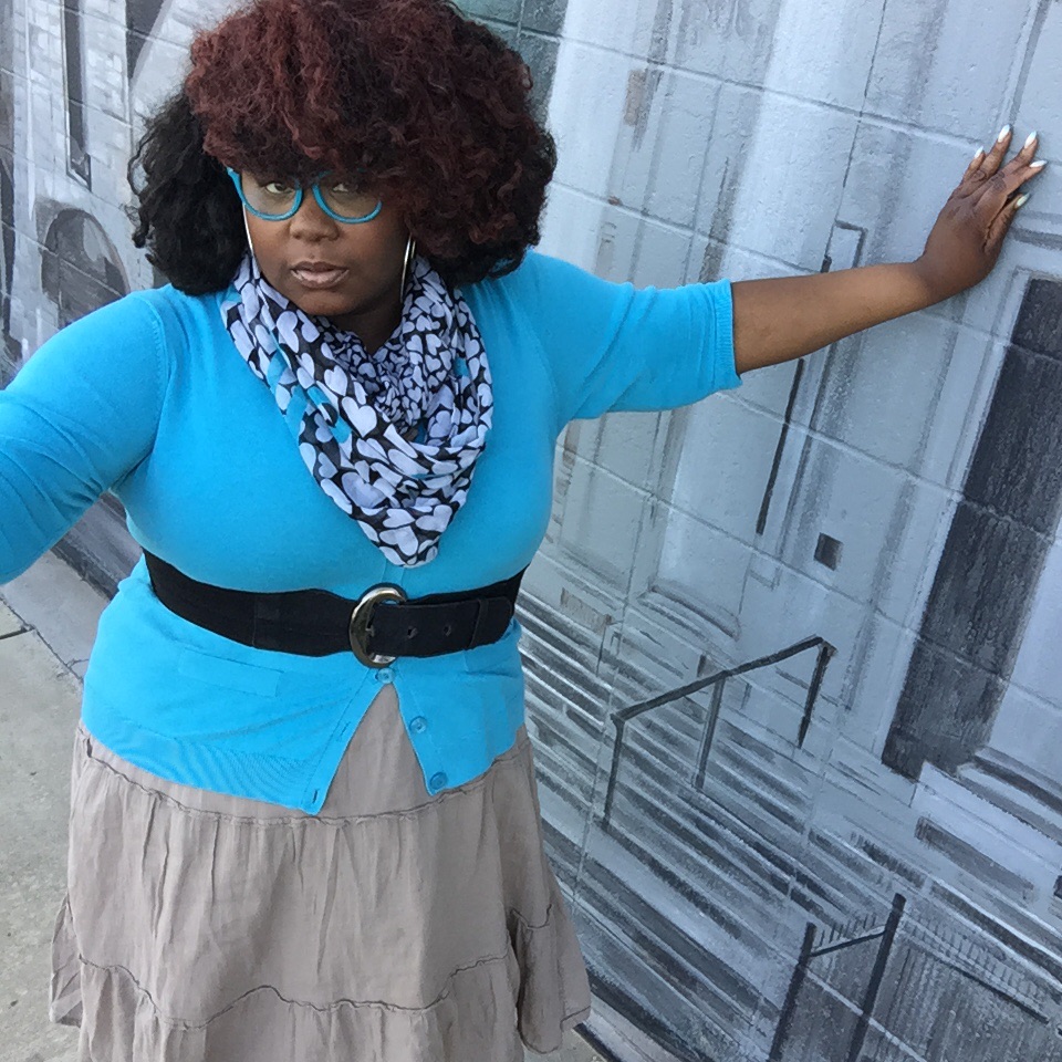 Blue Cardigan: DressBarn/ Scarf: Five Below/ Khaki Sundress: Old Navy/ Belt: Torrid/ Glasses: Beauty Boutique